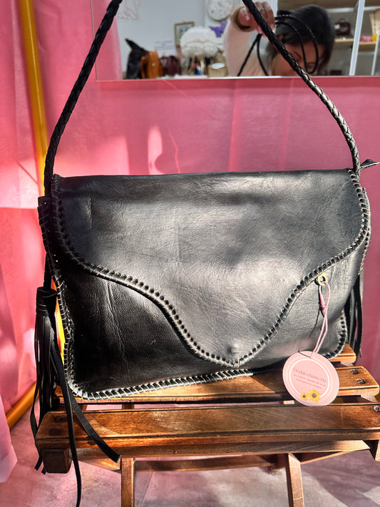 Bolso negro cuero bordado asa trenzada