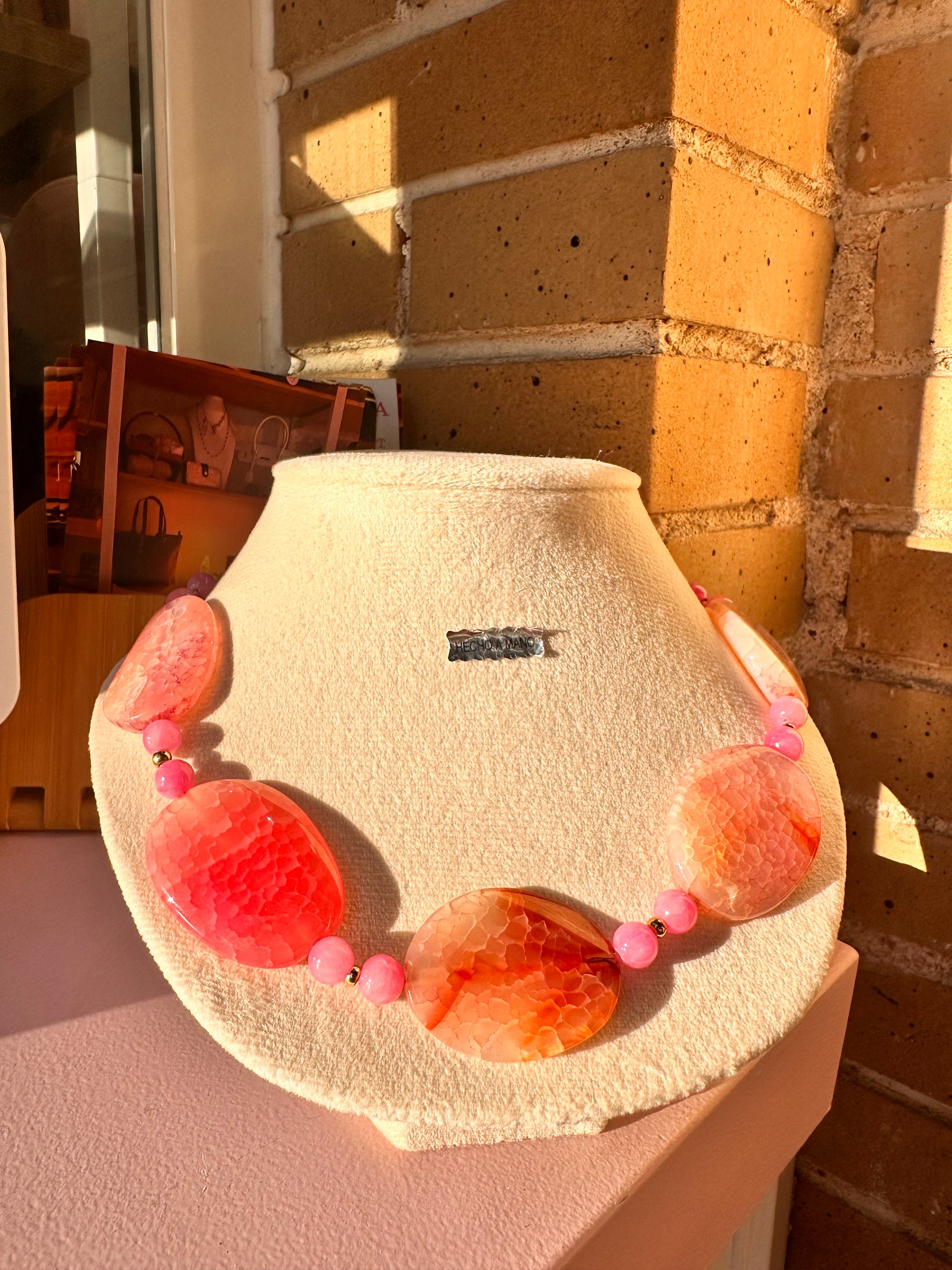El collar Dedulce es un collar único y con personalidad, se caracteriza por su color rosado en las ágatas. Son piedras naturales. También lleva bolitas de cuarzo rosa y bolitas de acero.